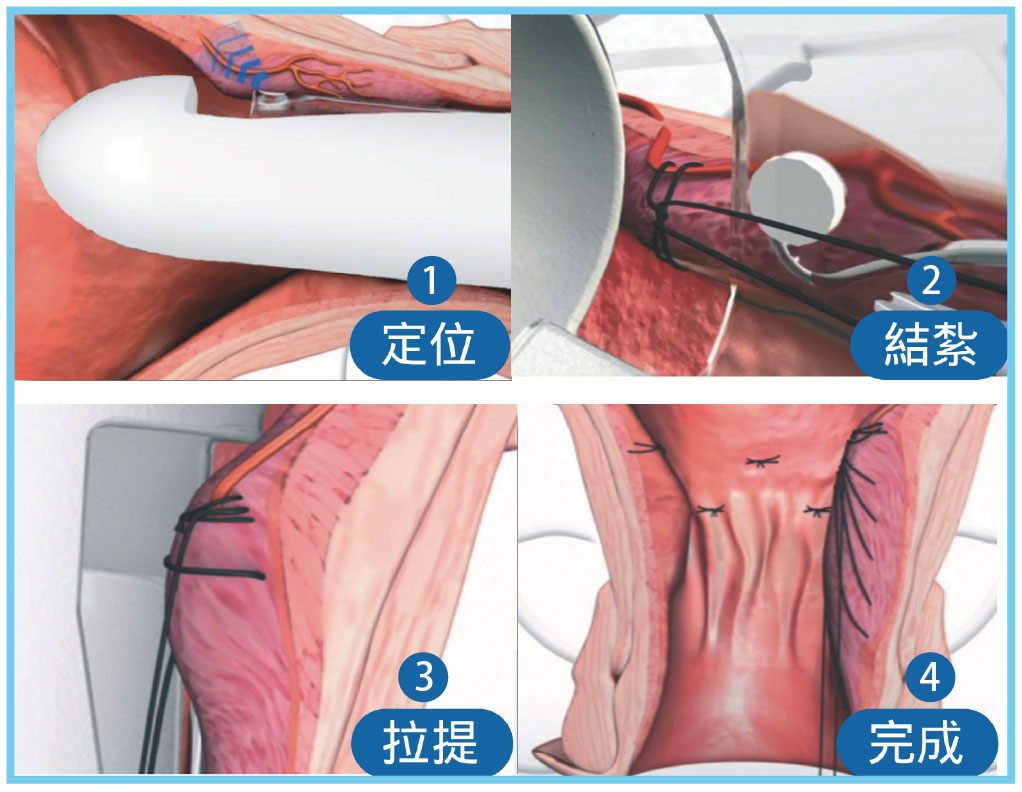 加強內痔脫垂治療的方式,適合較嚴重如瘡 常脫出甚至推不回去的病人。手術方式是醫生 用儀器探頭上可調式窗口,評估痔瘡大小,使用連續縫合的技巧,將痔瘡組織完整包覆,然後拉提至直腸深處,可減少因痔瘡脫垂掉出肛 門口的不適感。