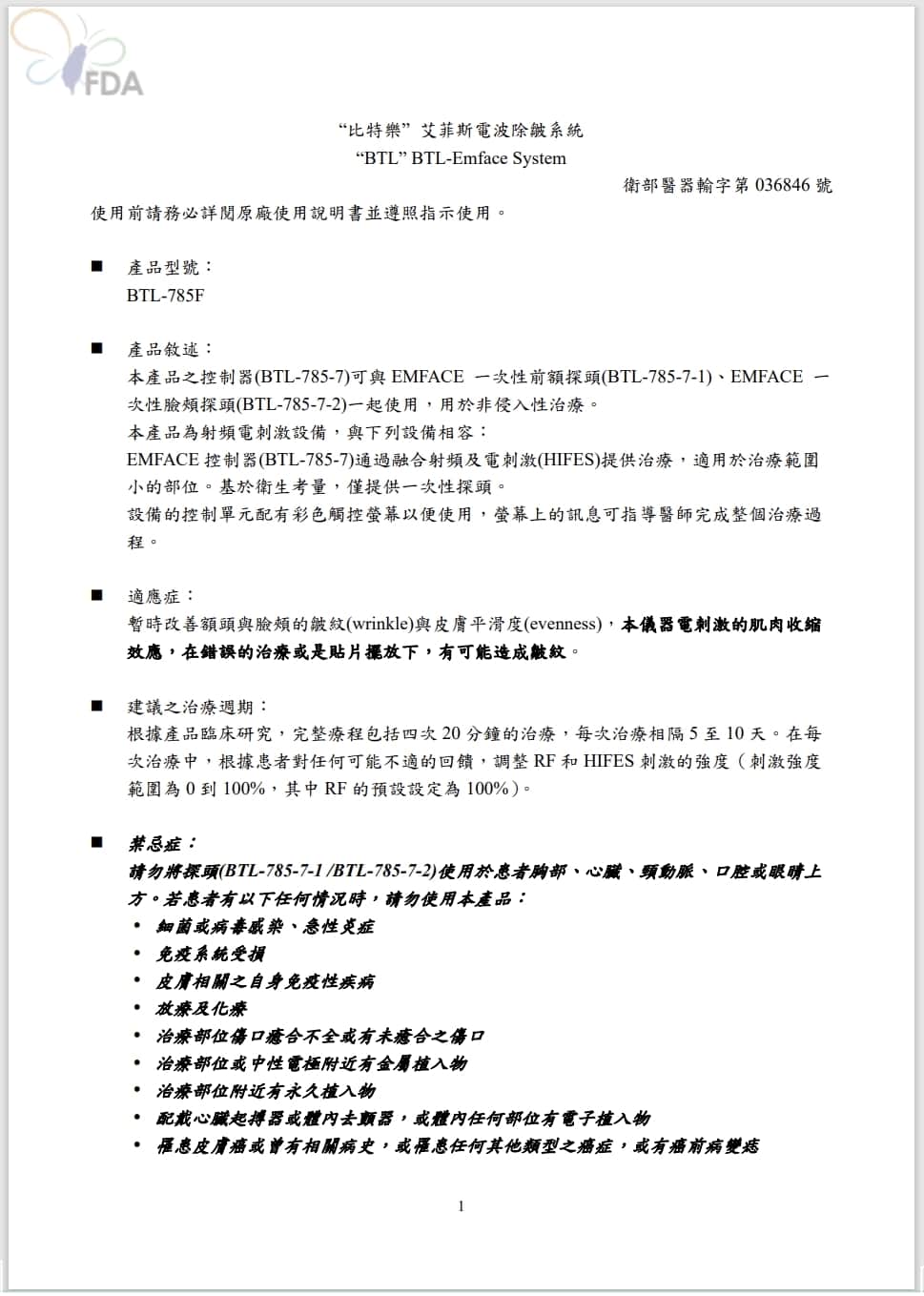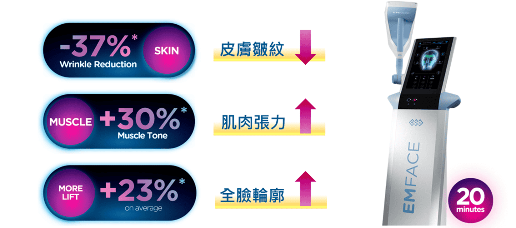EMFACE菲斯波(核准名稱:“比特樂”艾菲斯電波除皺系統 ) 使用非侵入高強度電場技術 (HIFES)科技搭配單極電波,EMFACE單次治療20分鐘,達到收縮臉部肌肉筋膜,改善臉頰、額頭、雙下巴等部位皺紋與增加平滑度,達到緊緻臉部線條與輪廓效果。
