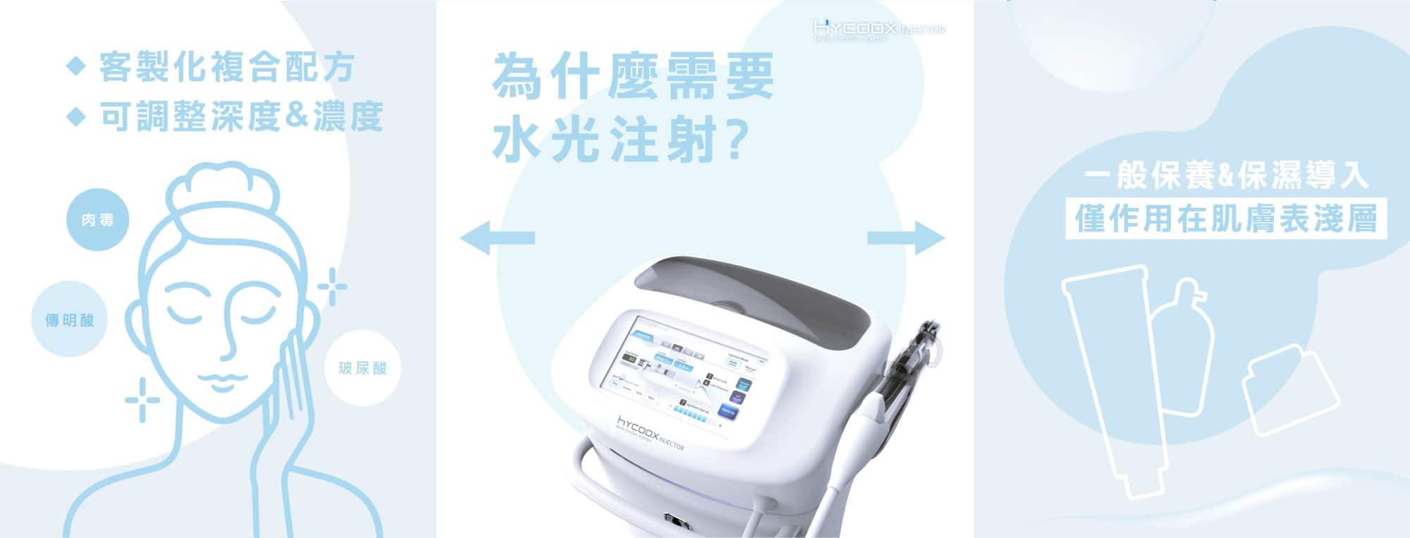 一般保養只能滲入皮膚表層,水光保養將藥劑導入至真皮層,營養成分根據皮膚客製調配,從內到外改善肌膚。做好定期護膚+定期施打水光針,雙重保養使肌膚更水嫩透亮。
